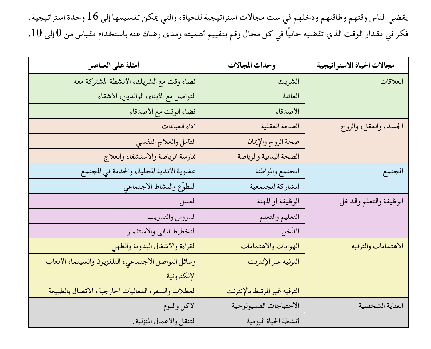 الأمر أشبه بجردة شاملة لحياتك اليوم واستكشاف ما تقضي أغلب وقتك وطاقتك فيه وتأثير كلّ هذا على النتائج التي تعيشها. هل أنت راضٍ؟ هل هناك مساحة للتحسين؟ استخدم الصورة التالية لتقييم حياتك. يمكنك التفصيل والاسهاب لتعكس حياتك ومجالاتها الفعلية. قد يستغرق اكتشاف هذه الخطوة فترة من الزمن والكثير من التذكر والتفكير، نصيحتي المجرّبة لا تتجاهلها!